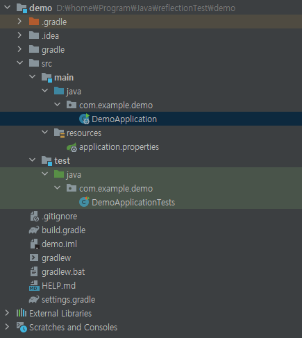 아무런 dependency를 추가하지 않은 프로젝트를 생성하면 아래와 같은 구조로 생성된다.