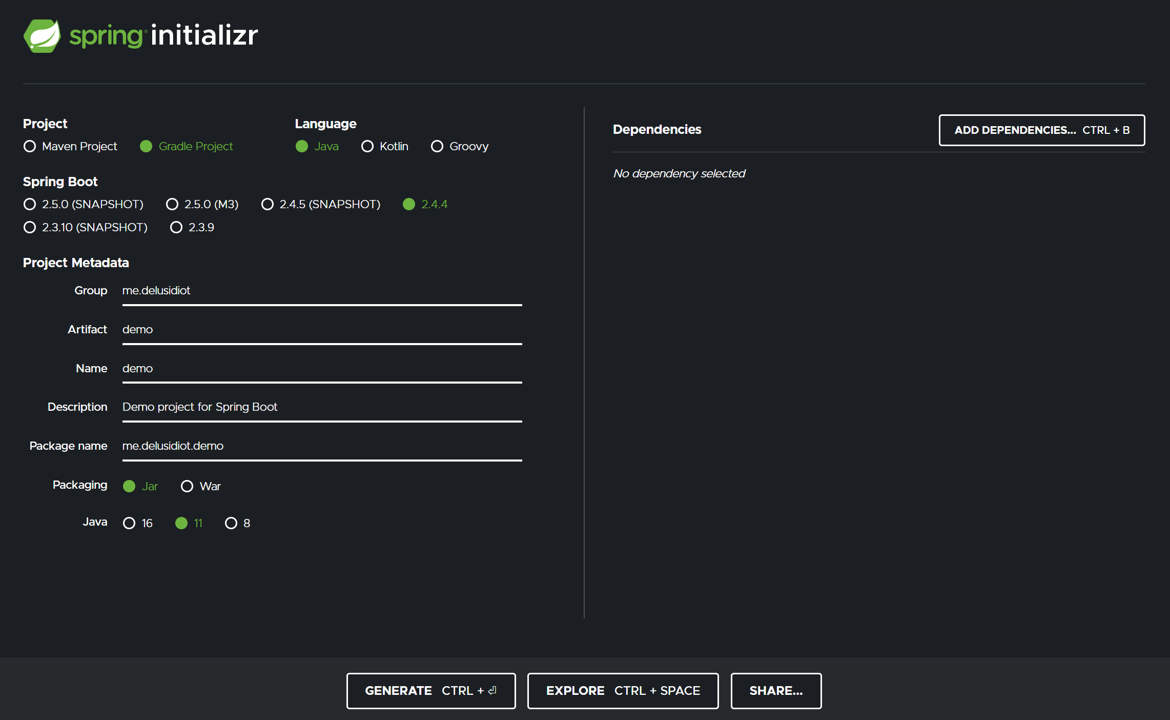 먼저 Project Build Tool을 선택할 수 있다. Maven또는 Gradle은 프로젝트의 의존성 관리를 하기 위한 시스템이며 MavenRepository에서 개발자가 필요로하는 라이브러리를 가져와 사용할 수 있도록 도와주는 도구이다. Maven은 Ant와 더불어 인기가 식어가고 있으며 새로운 프로젝트에는 Gradle이 많이 사용되고 있다.