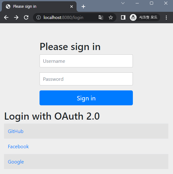 각 플랫폼의 client-id와 client-secret을 추가할 때마다 아래 Login with Oauth 2.0의 목록이 추가되는 것을 확인할 수 있다. 각 목록을 클릭하면 각 플랫폼의 로그인 화면으로 갈 수 있으나 현재 client-id와 client-secret은 임의로 넣은 것이기 때문제 제대로 동작하지 않고 에러화면으로 전환된다.
